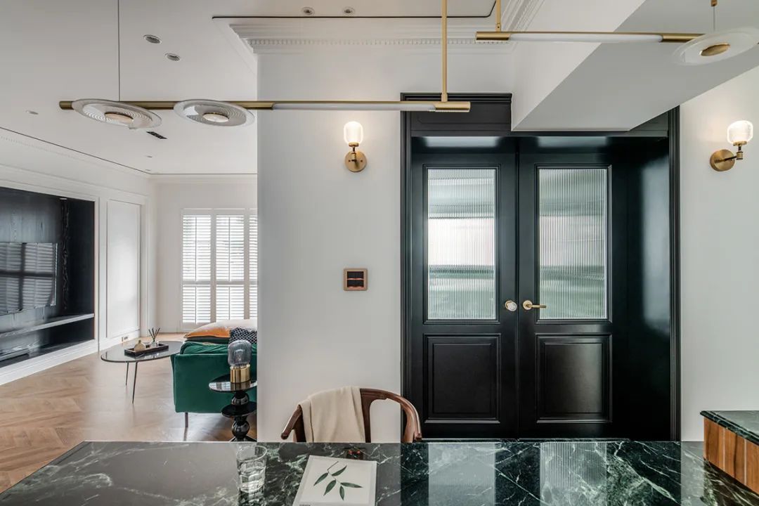 透明的玻璃玄关,保护隐私的同时,将屋外的光引入,让空间充满着光的律动性与轻盈感。