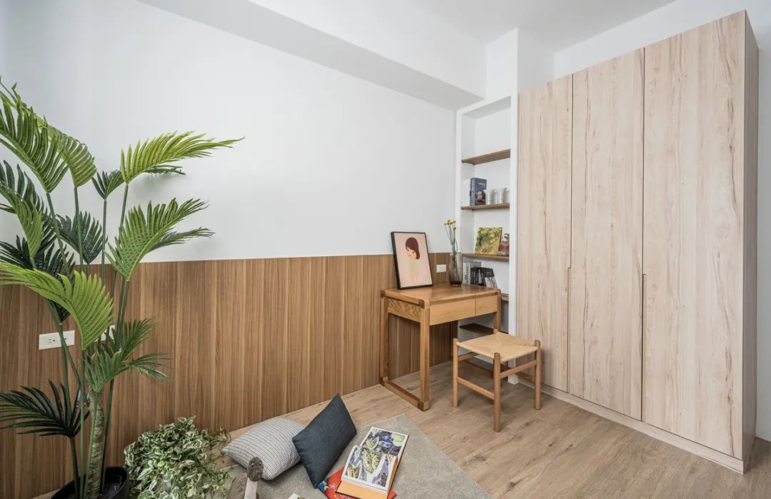 只是用木纹饰面板包覆墙面, 并预留摆放书桌的空间,可以随着孩子年龄变化,满足各阶段所需。