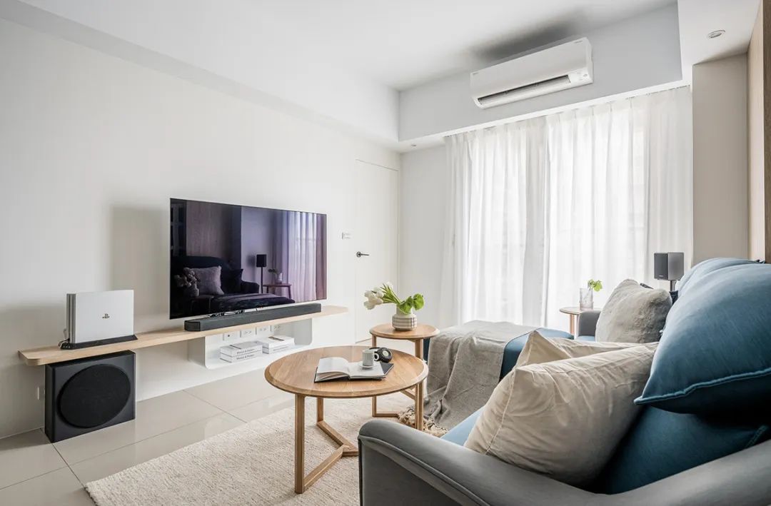 沙发后方是隐形墙,可随时开合,这样做解决了沙发上方的横梁。