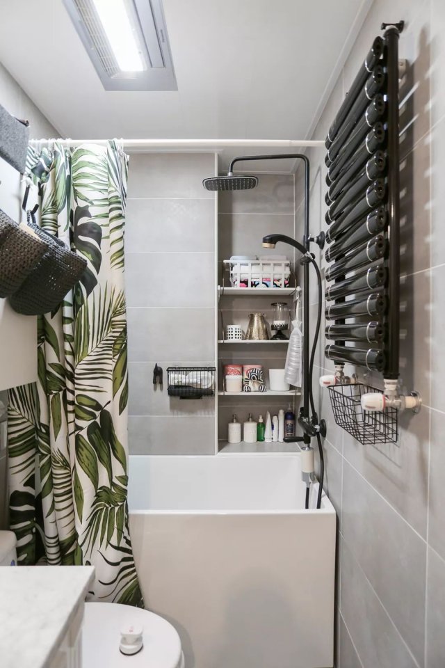 唯一别忘了的就是,不但要买浴帘,还要把浴帘下端搭到浴缸里边去,要不水顺着浴帘流下来,最终还是流得满地都是。