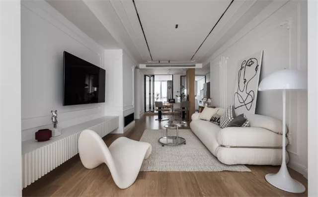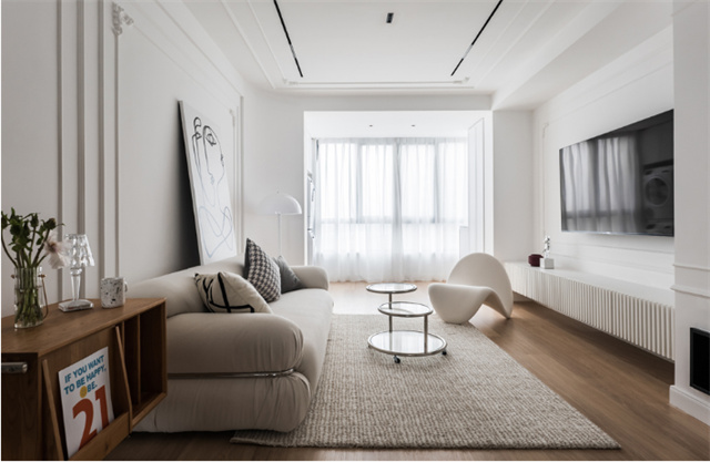 客厅墙顶均用温柔奶油色,PU线条装饰,保持素净底色的同时,不失精致优雅。通铺木地板温润有质感,无声中营造温馨居家感。