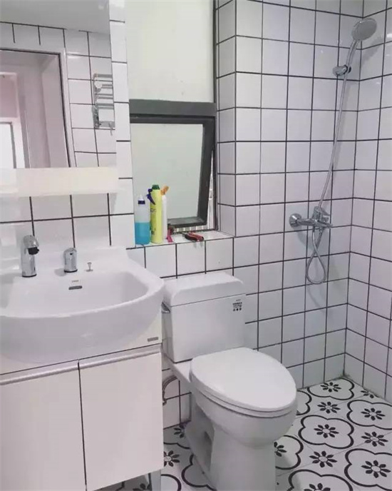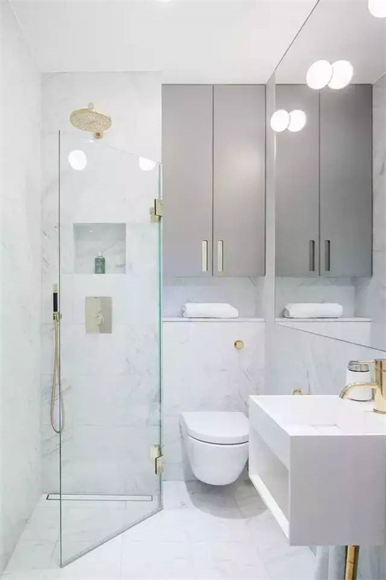 或者干脆就不做浴帘,没有干湿分离的卫生间就需要把下水做好,避免马桶后方、浴室柜底部成为积水区。每次洗完澡拖一下地板,擦下墙面,也能让卫生间干爽一些。