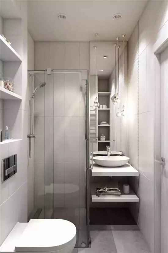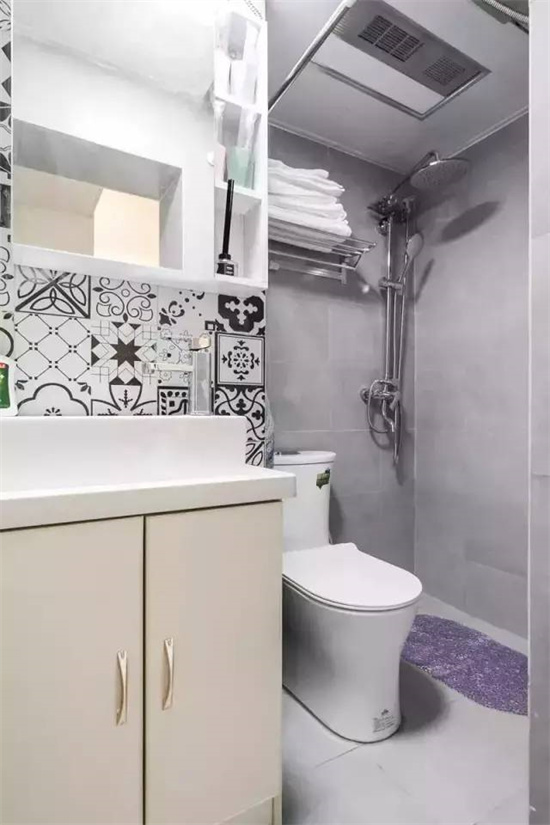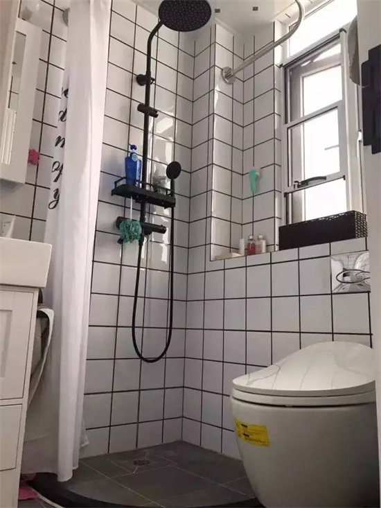 像一些只有2平米左右的卫生间,就没办法彻底干湿分离了,你可以选择把浴帘放在马桶和浴室柜之间,让马桶位于淋浴区内。